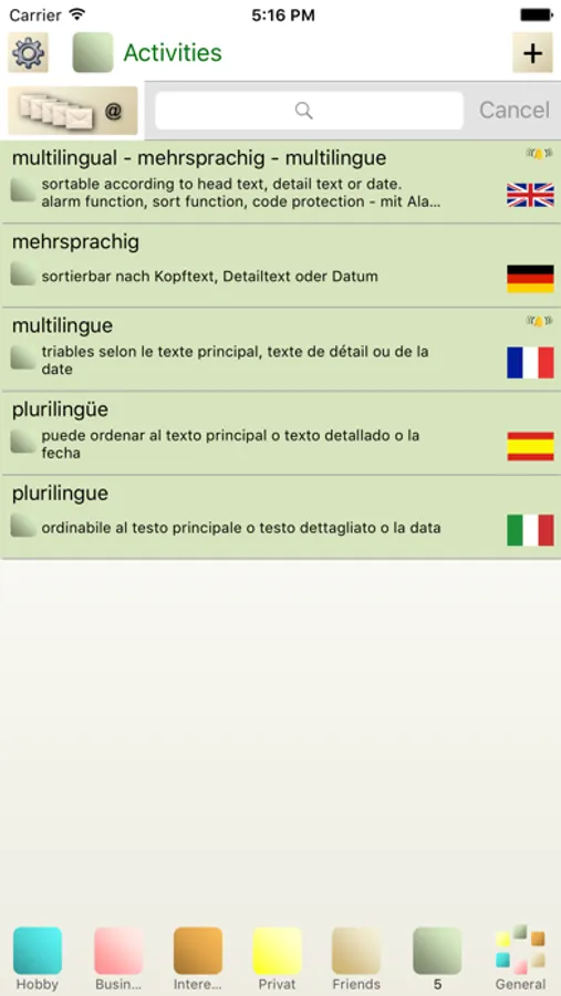 All notes can be grouped into categories. Category name is freely definable.