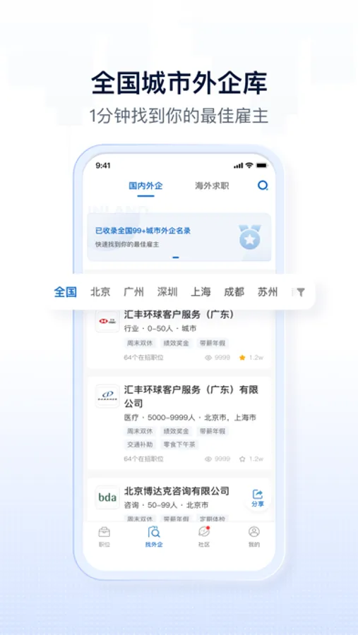 创新找工作解法,让每一家优质外企都能被看见。仅需 1 分钟,掌握意向城市外企名单,快速找到心仪雇主。目前已更新包括 #北京、#上海、#广州、#深圳、#成都、#杭州、#苏州、#南京、# 武汉、#西安、#重庆、#青岛、#郑州、#天津等 99 + 城市的外企招聘机会,覆盖全国各大主要城市。