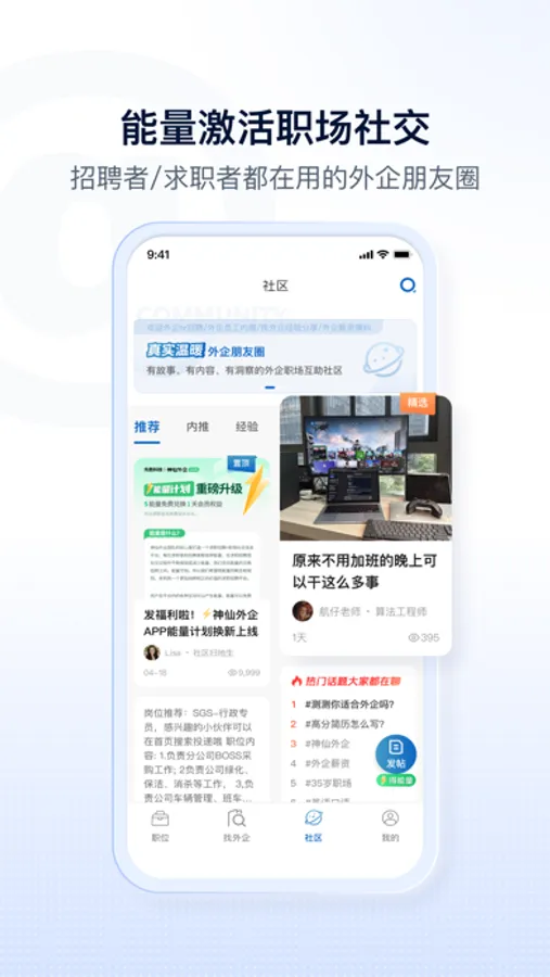 真实的外企职场互助社区,汇聚HR 招聘信息、外企员工内推信息、找外企经验分享以及外企薪资爆料等。建立自己的职场朋友圈,与同行交流互动,获取求职建议和职场经验。