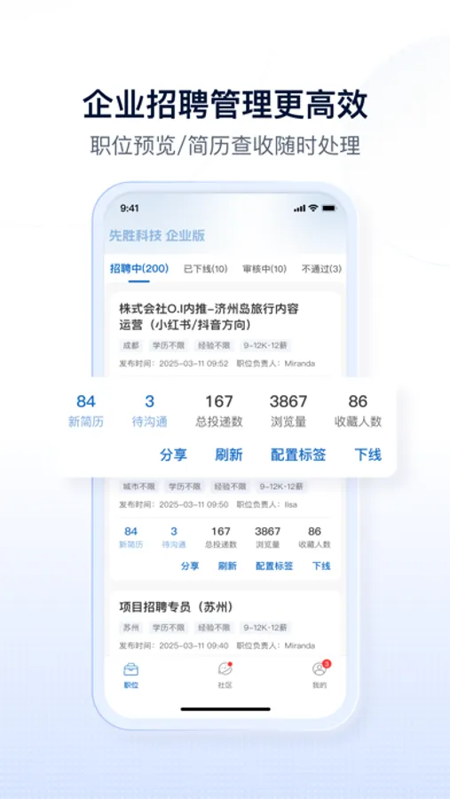 招聘者注册成功后,可以查看职位及投递数据,发布社区内容并互动,垂直服务于外企求职招聘场景,主打“高效匹配+职场社区+外企专属服务”