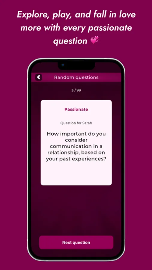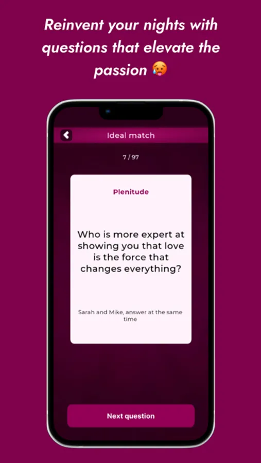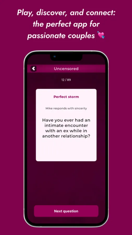 Enjoy question and challenge games designed to strengthen your romantic bond. Discover more about your partner with a wide variety of topics, phrases, and free mini-games.