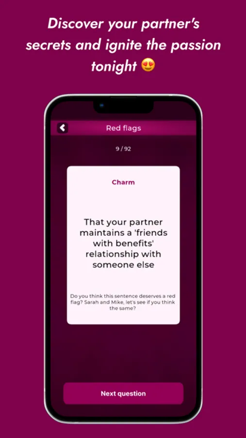 Our couple's and lovers' game provides conversation starters to explore your partner’s fun and hidden fantasies. And if you’ve just met, you can break the ice effortlessly. Even if you have regular conversations, there’s always something new to discover about your partner if you try our free Game of Love app