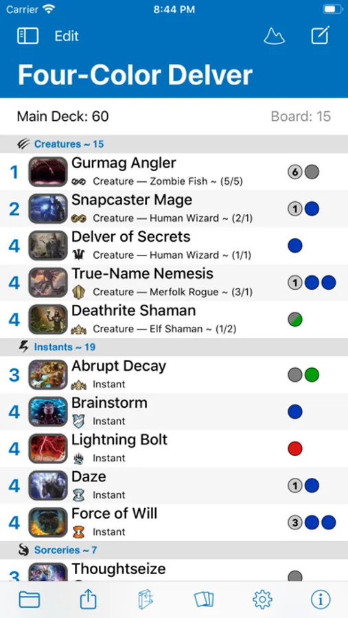 - See a complete break down of your deck by Converted Mana Cost, Color and Card Type