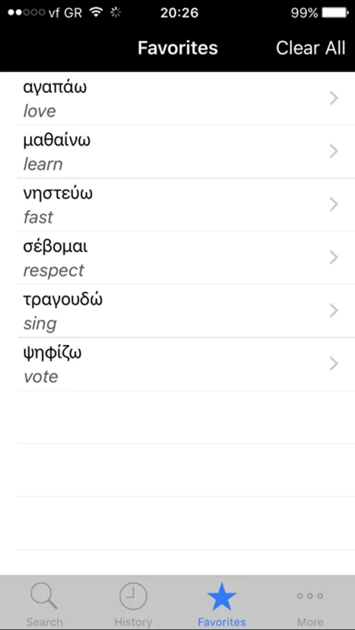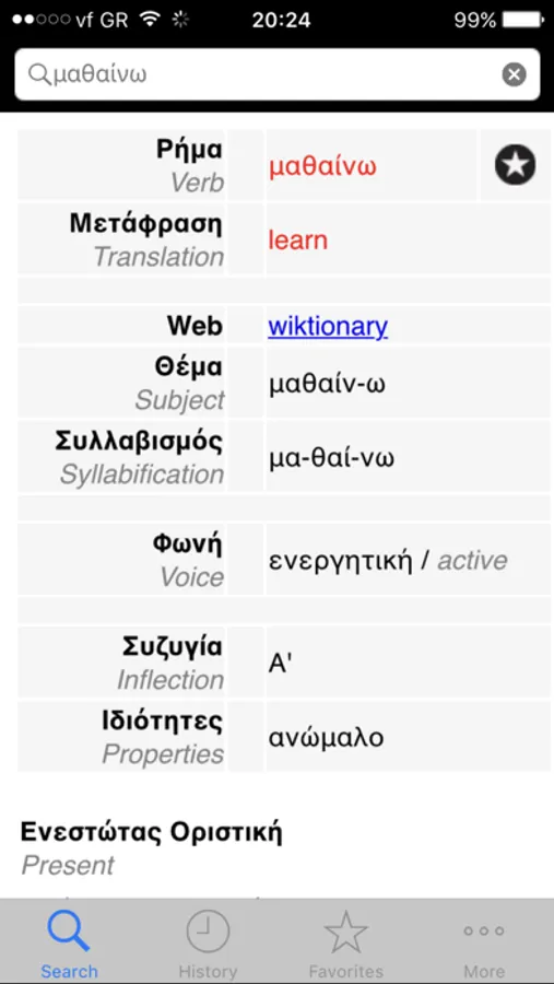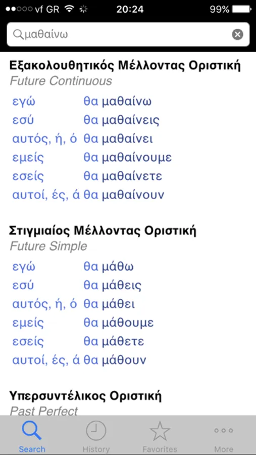 Enjoy more than 3000 conjugated modern Greek verbs in active and passive voice. The database is local to your device so no internet access is required. You can search for a verb in both Greek and English or use the index where all the verbs are listed alphabetically.