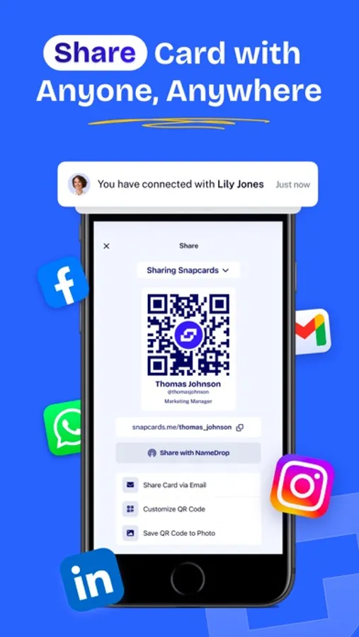 >> Share your card through links, QR codes, AirDrop, Namedrop, or text messages.
