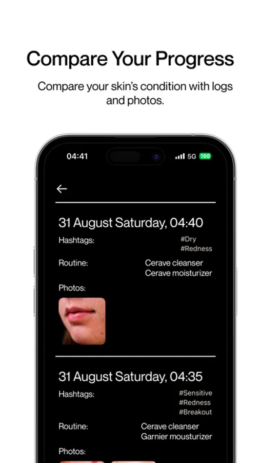 - Entry Comparison: Compare two entries side by side to see how your skin has transformed. Understand what works best for you by reflecting on your journey.