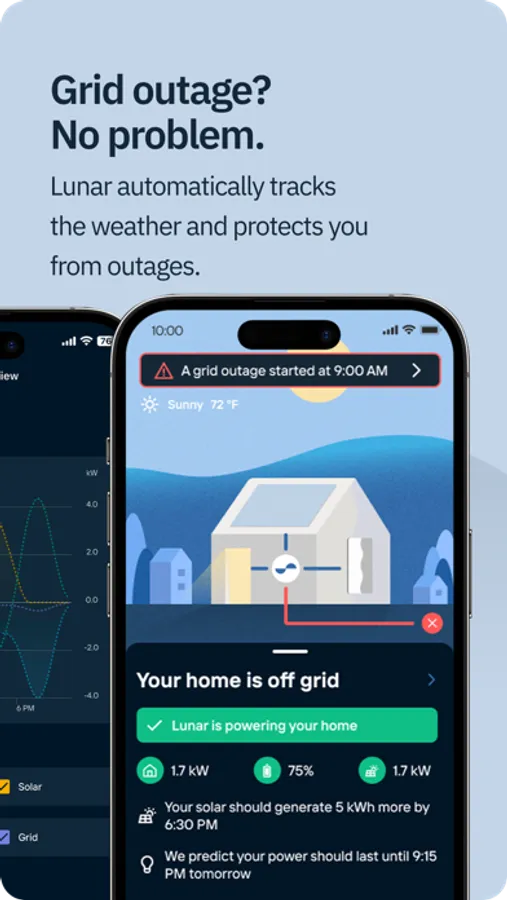 - Power through grid outages with confidence. The Lunar System seamlessly takes over during an outage, and the Lunar App shows you how long you'll last at your current electrical usage.