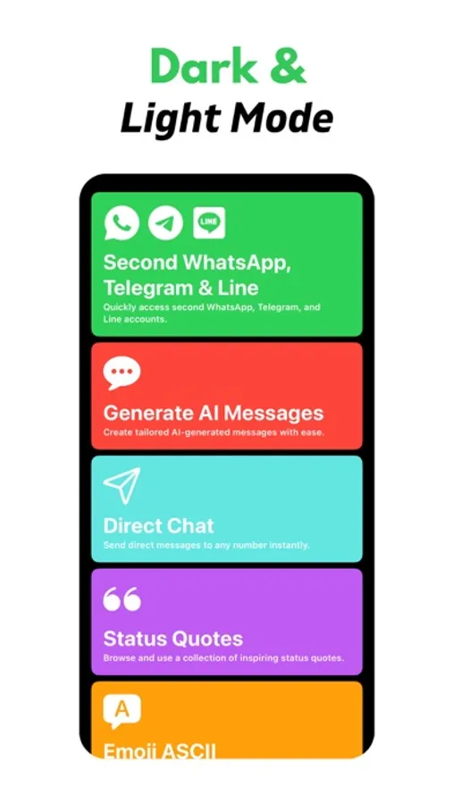 - Direct Messaging: Send messages directly to any number on WhatsApp, Telegram, or Line without saving them in your contacts. Perfect for quick, hassle-free communication.