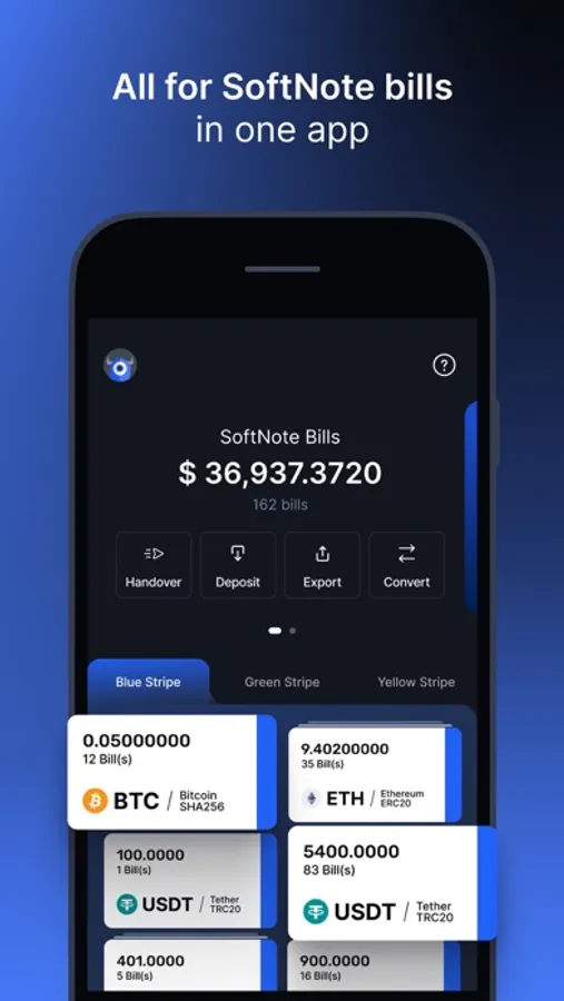 •Effortlessly manage your SoftNote Bills with features such as Balances Display, Handover, Deposit, Export, and Convert, giving you full control over your digital assets.