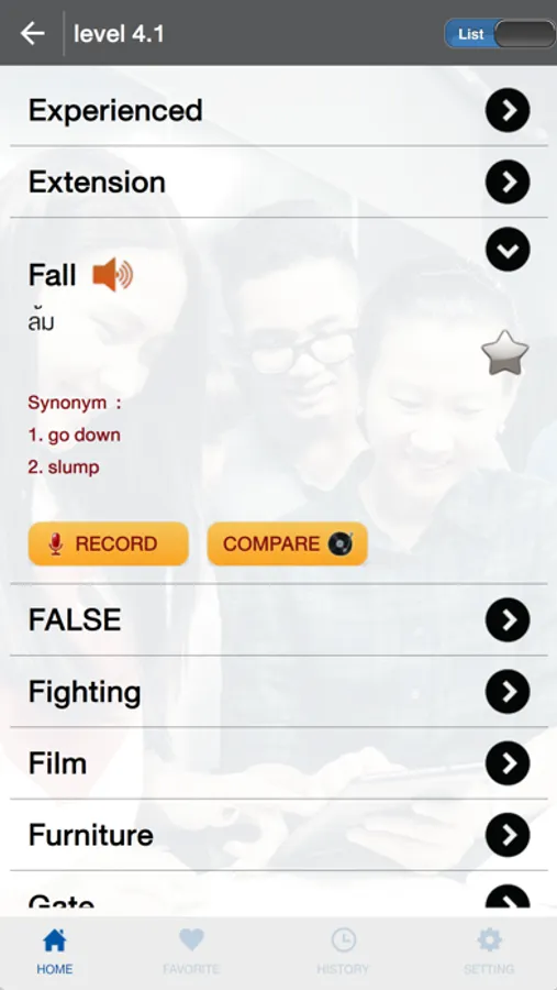 - Compare : สามารถเรียกฟังเสียงที่บันทึกไว้ และเสียงตัวอย่างจากเจ้าของภาษาเปรียบเทียบพร้อมๆ กัน