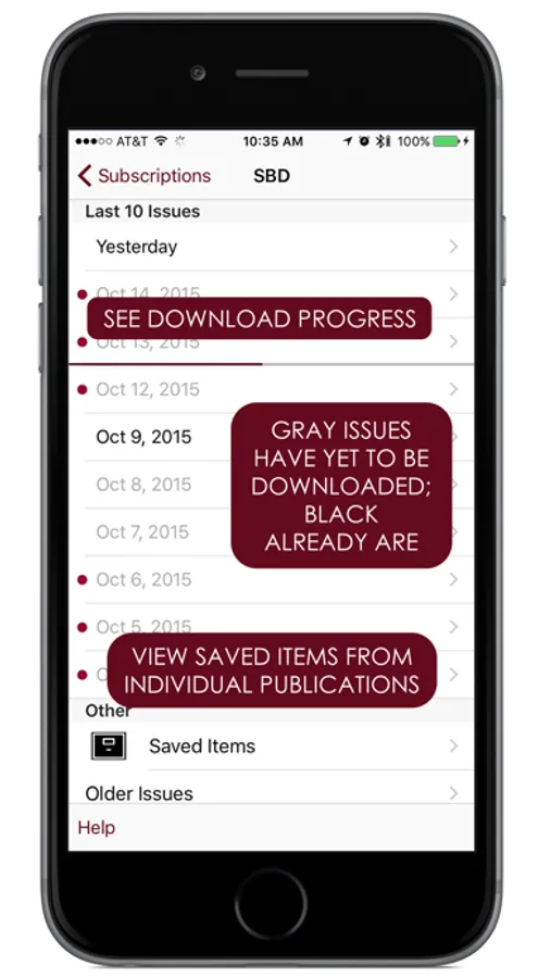 SAVING AND DELETING ISSUES: The app will automatically delete downloaded issues beyond the last 10 available issues. To manually delete an issue, swipe to the left across the issue date.