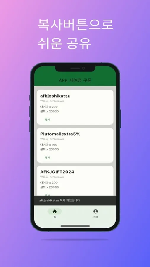 복사버튼으로 손쉽게 쿠폰을 복사하여 AFK 새로운 여정에서 사용하세요.