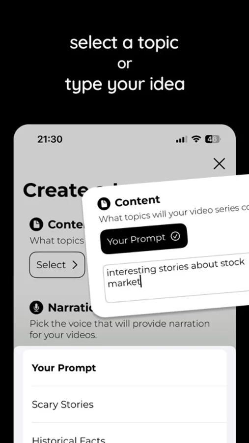 Choose Your Niche: Select from a wide range of topics or create your own custom prompts for personalized video content tailored to your audience.