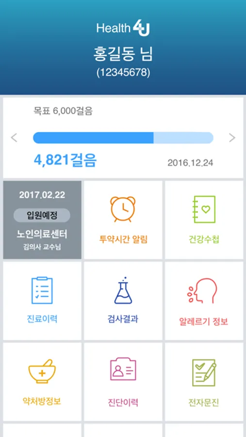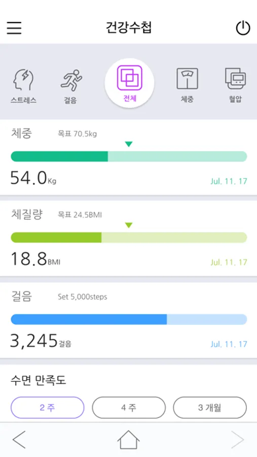 5.건강수첩 : 활동, 체중, 혈압, 혈당, 수면, 스트레스 등의 데이터 입력하여 관리하실 수 있습니다. 입력하신 정보는 그래프 또는 목록으로 확인하실 수 있습니다.