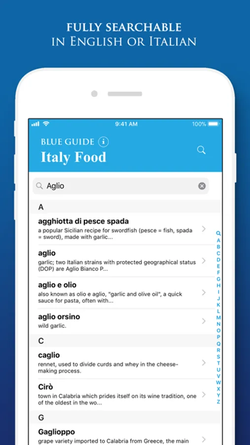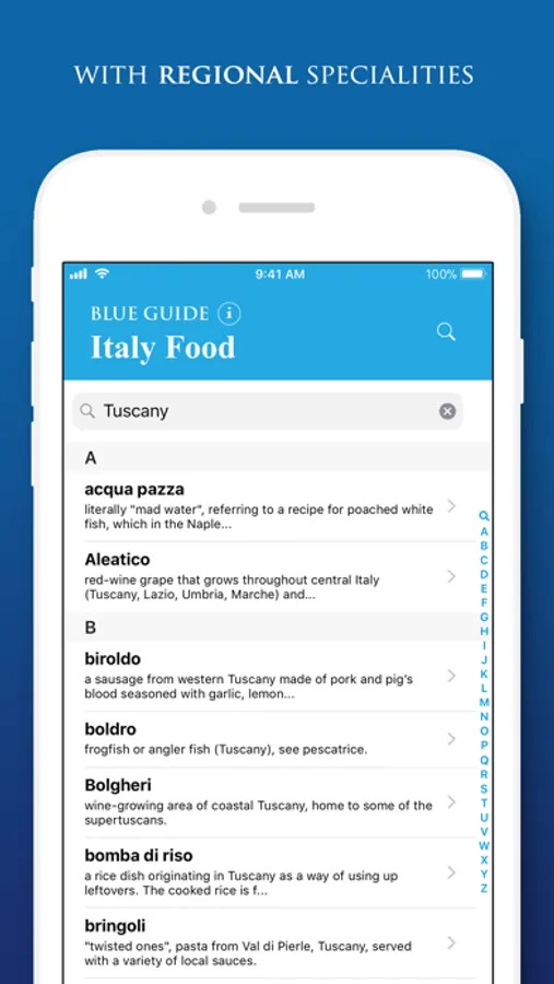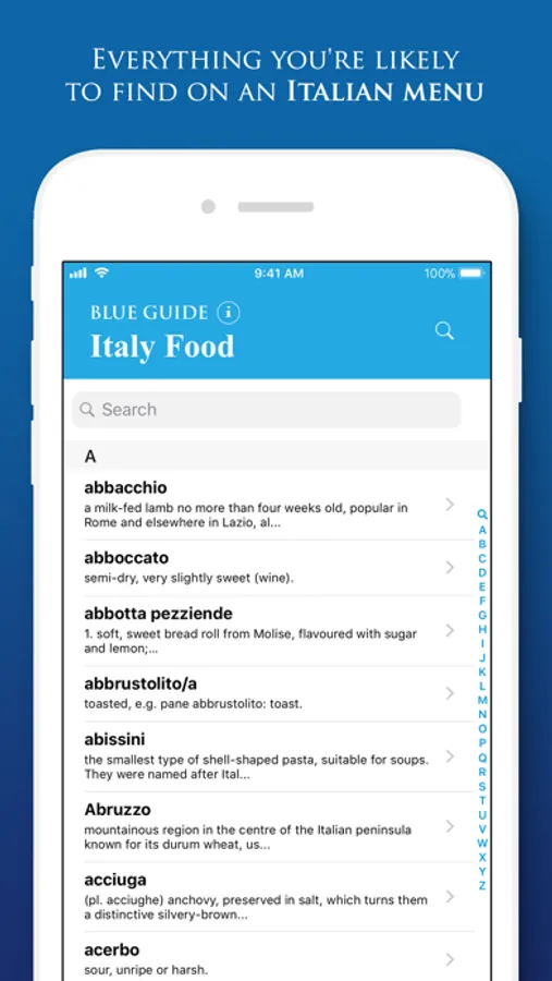 The Blue Guides Italy Food App provides a dictionary and miscellany of all the Italian food and drink words you are likely to find on a menu or in a market. Suitable for browsing or on-site use, it is a self-contained app which once downloaded does not need Internet access and thus incurs no expensive roaming charges or download delays. With full searchability and indexing you can find what you want instantly. A sound file for every single entry gives immediate pronunciation guidance.