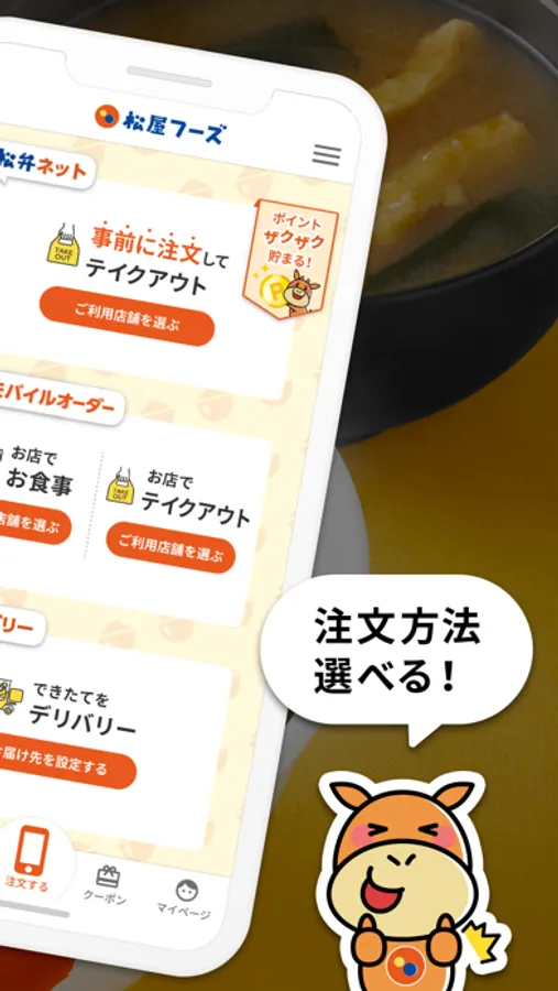 松弁ネット、松屋モバイルオーダー、松弁デリバリーの3種類のスタイルでご注文が可能!松屋ポイントが貯まります。