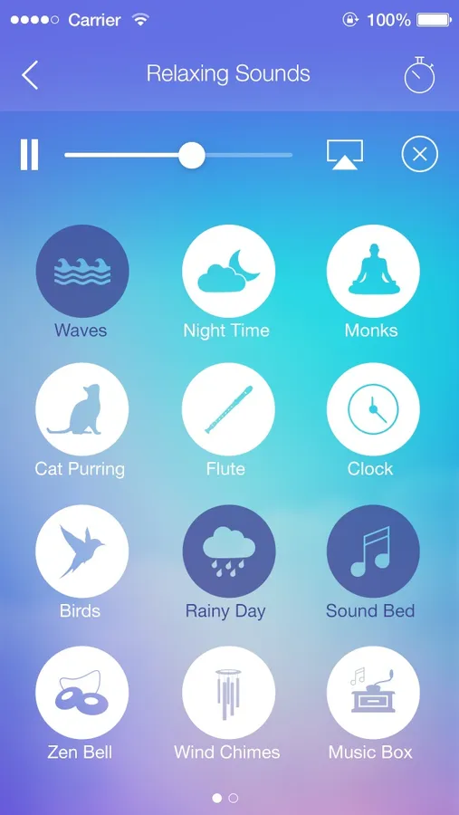Ocean Waves, Night Time, Monks, Cat Purring, Flute, Clock, TV Static, Rainy Day, Sound Bed, Zen Bell, Wind Chimes, Music Box, Light Rain, Crystal Bowl, Peepers, Sunny Day, Melody, Thunderstorm, River, Fireplace, Sitar, Electric Fan, Windy Day, Zen Music
