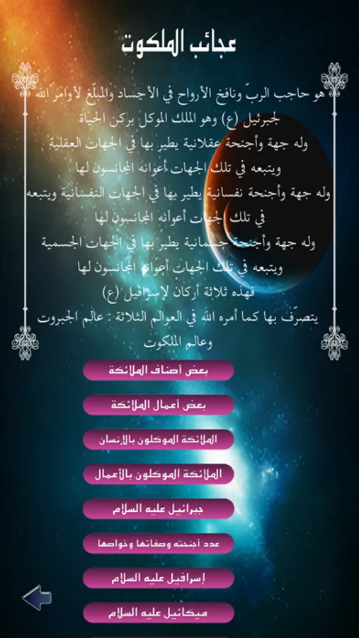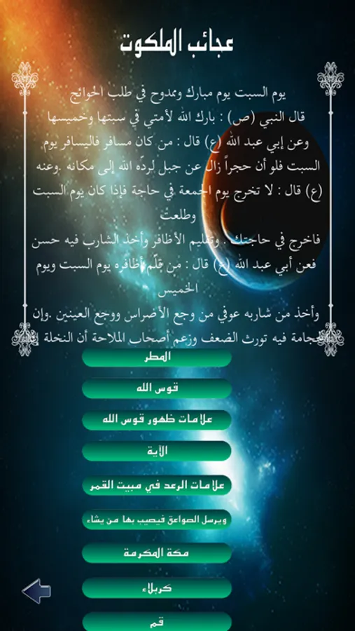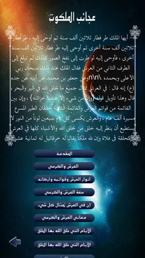 وأسأل من نظر في التطبيق هذا (عجائب الملكوت)، إن رأى فيه عجائب تأباها الضباع، فليعلم إنه لا شيئ يستعظم أمام قدرة الخالق وجبلة المخلوق، فجميع ما فيه إما عجائب صنع الباري جل جلاله وذلك إما بالمحسوس أو المعقول لا ميل فيها ولا خلل، وإما خبر مروي عن النبي أو أله عليهم الصلاة والسلام وهم خزانة علم الله وتراجمة وحيه، وإما خواص غرببة وذلك مما وفي العمر بتجربتها، فكن منها على ثقة وإزداد بها حكمة، وهذا التطبيق مفهرساً متسلسلاً من العلويات والسفليات، وأستغفر الله من ذلل القلم وعصيان الحكم والله الموفق للصواب وإليه المرجع والماب.
