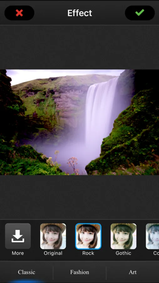 Classic, fashion and artistic three photo effect styles can be selected. A large variety of popular stylized effects like rock, gothic,auto contrast, auto tone, blur, sharpen, black & white high contrast styles to modify your photos. Plus, users can download more other photo special effects to meet their needs.