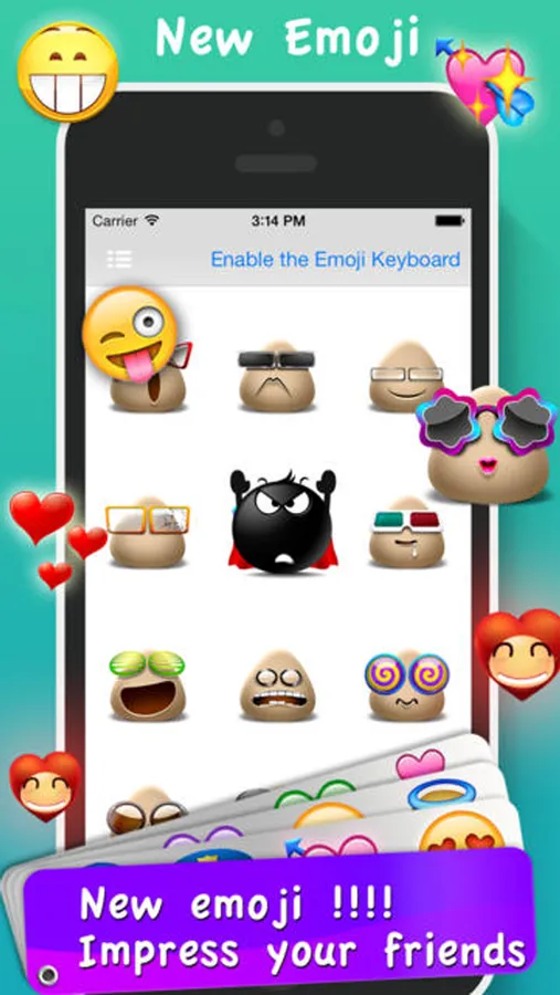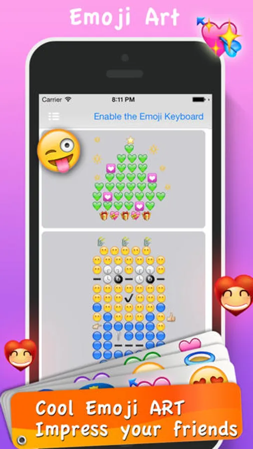 7 kind of custom emoji keyboard with large number of cute symbols, you can use it to creat your own graphics or emoji arts.