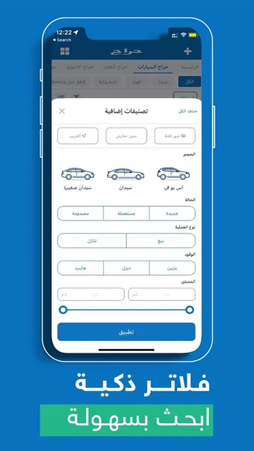 - سهولة البحث عن السيارات بواسطة فلاتر الاعلانات الجديدة الماركة والموديل ونوع الوقود والمعروضة للتنازل.