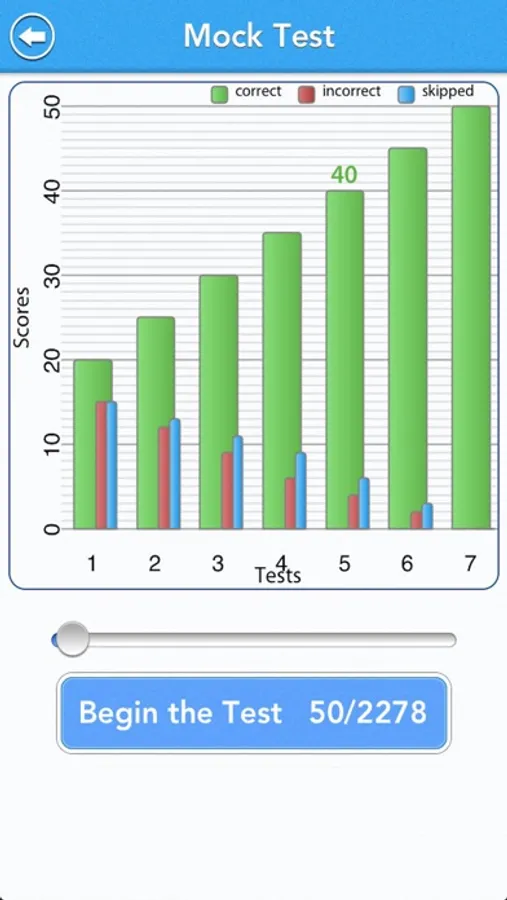 Mock Test covers all the 1100 words both ways and records your progress as you take them.