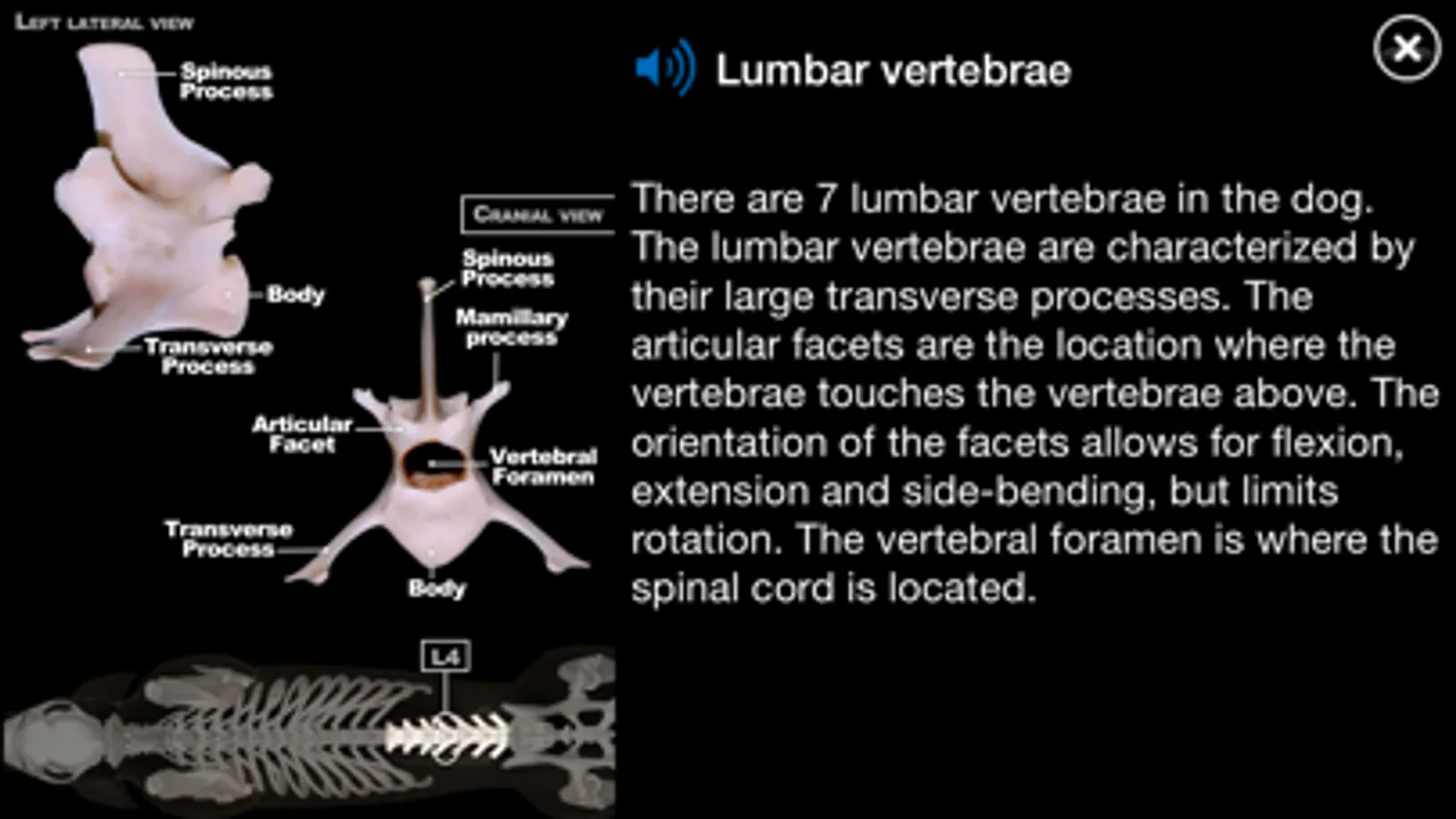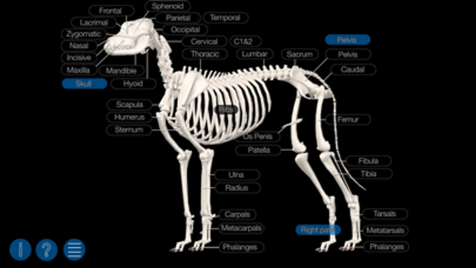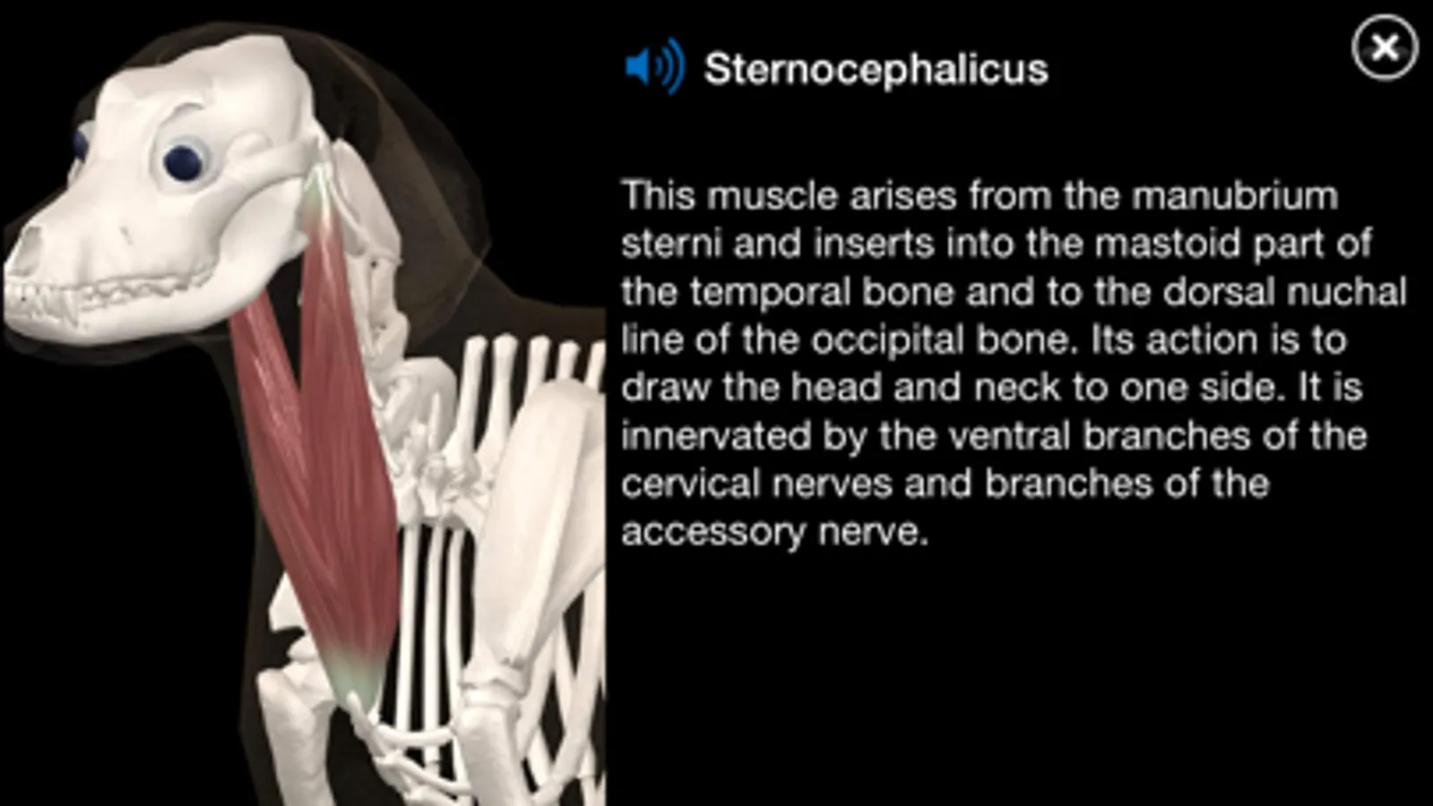 An interactive visual reference with over 300 anatomical structures. Rotate the model, cut down through layers, or zoom in. Tap the labels to get details of each structure with audio pronunciation, text descriptions and a close-up view. This app covers the superficial landmarks, superficial and deep muscles, bones, and organs. Quiz yourself on each section, make your own quiz, or have the app quiz you on just what you missed. If you want to understand canine anatomy, this app is for you.