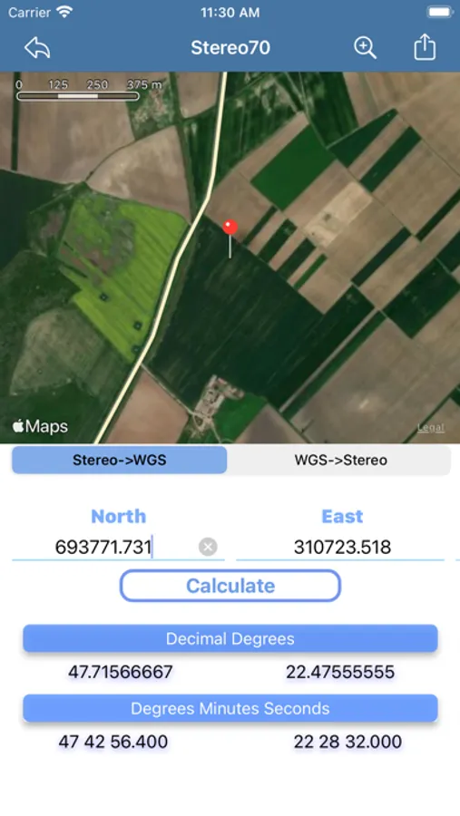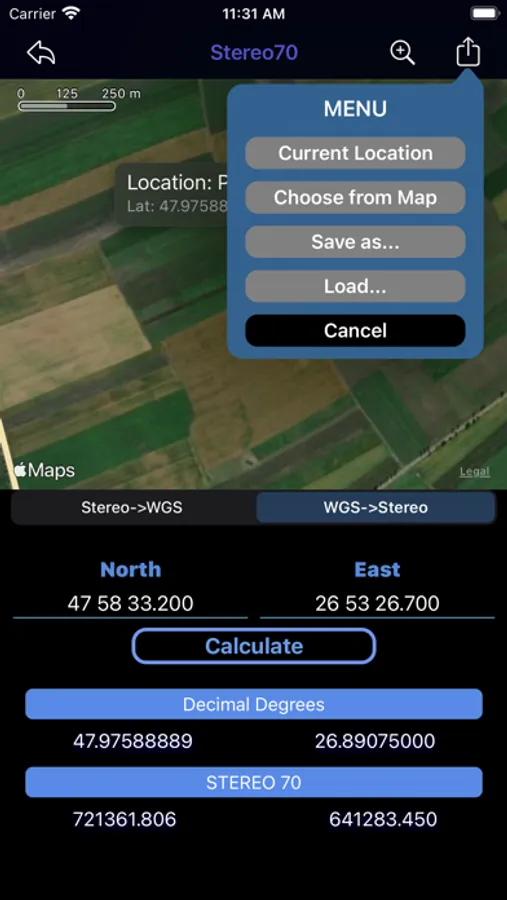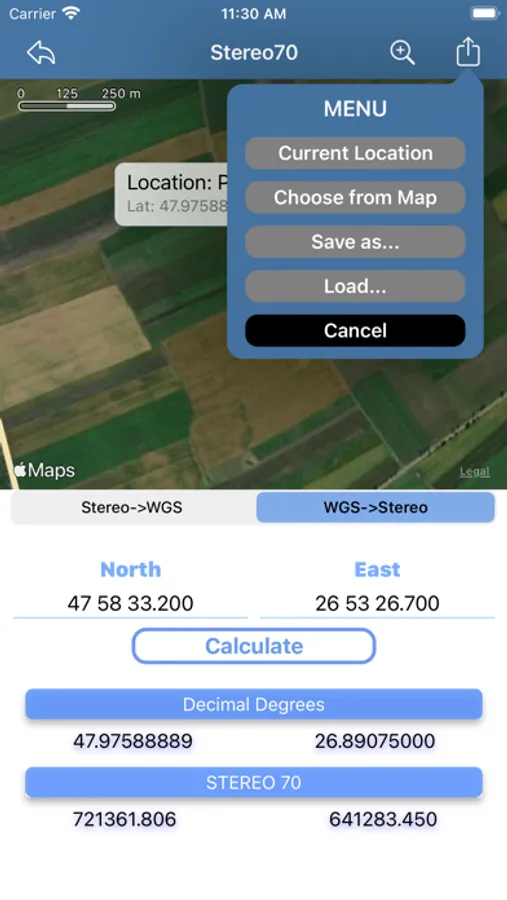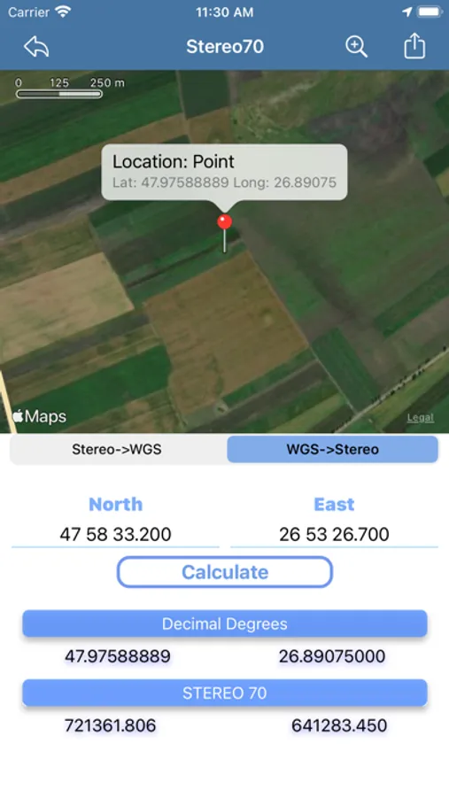 iStereo70 the first application for iPhone and iPad which help you to convert coordinates Stereo70 to WGS84 (ETRS89) or vice versa and check the location on Map (requires an internet connection).