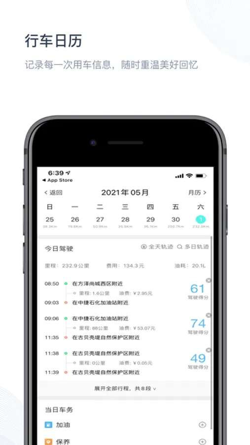 【用车数据】记录汽车的每一次加油、保养、维修、年检、保险等信息,App自动推送提醒,对每一次用车了如指掌。
