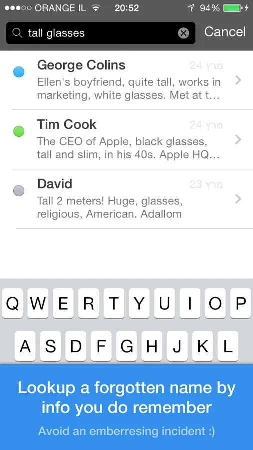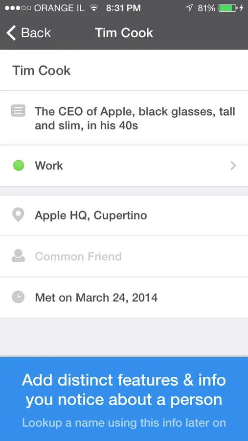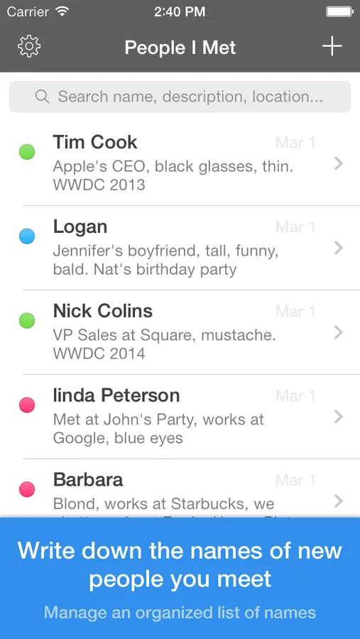 Quickly add names of new people you meet, fill up their description, and easily find their name later by looking them up by their features (description, looks, meeting location, common friends).