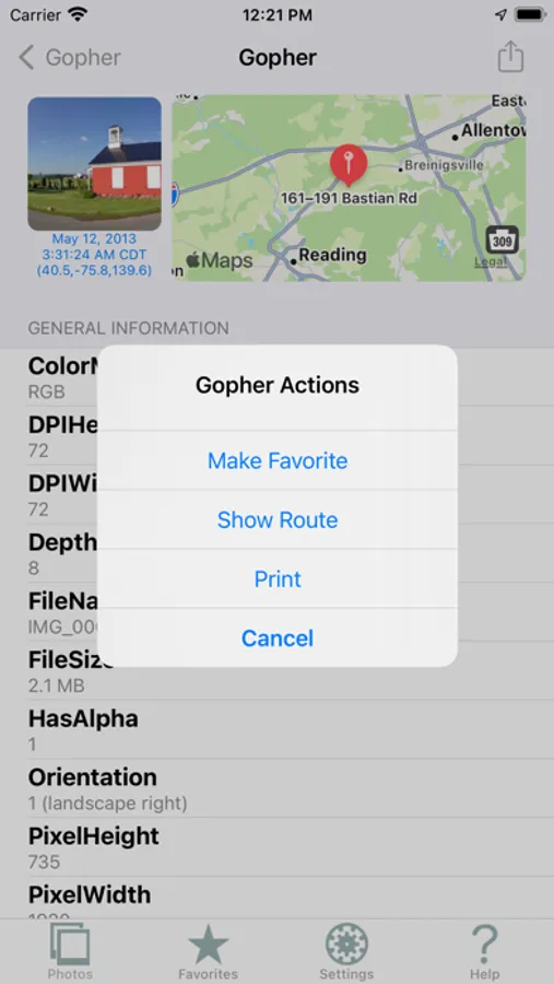 • Show Route - if the picture's metadata contains GPS information then invoke Maps to display travel directions, using that location as the destination and the current location as the starting point. You may select the route type and map type in Settings.