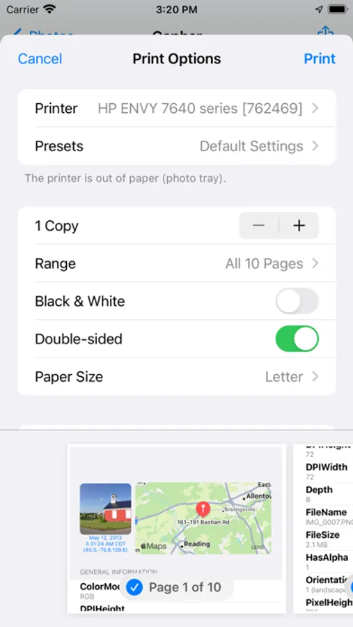 • Print - prints the picture's metadata in human readable form, formatted for 8.5" x 11" paper in landscape orientation.