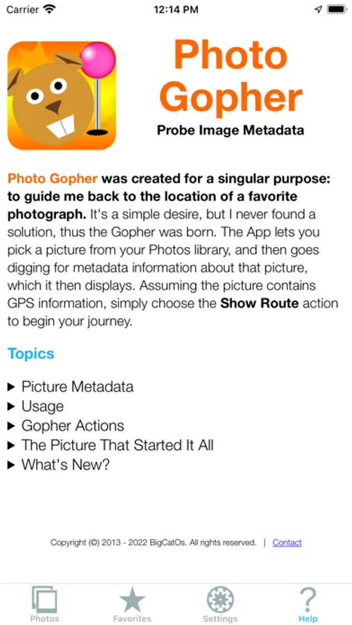 Photo Gopher was created for a singular purpose: to guide me back to the location of a favorite photograph. It's a simple desire, but I never found a solution, thus the Gopher was born. The App lets you pick a picture from your Photos library, and then goes digging for metadata information about that picture, which it then displays. Assuming the picture contains GPS information, simply choose the Show Route action to begin your journey.