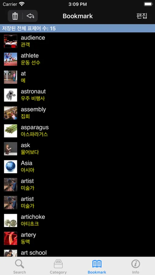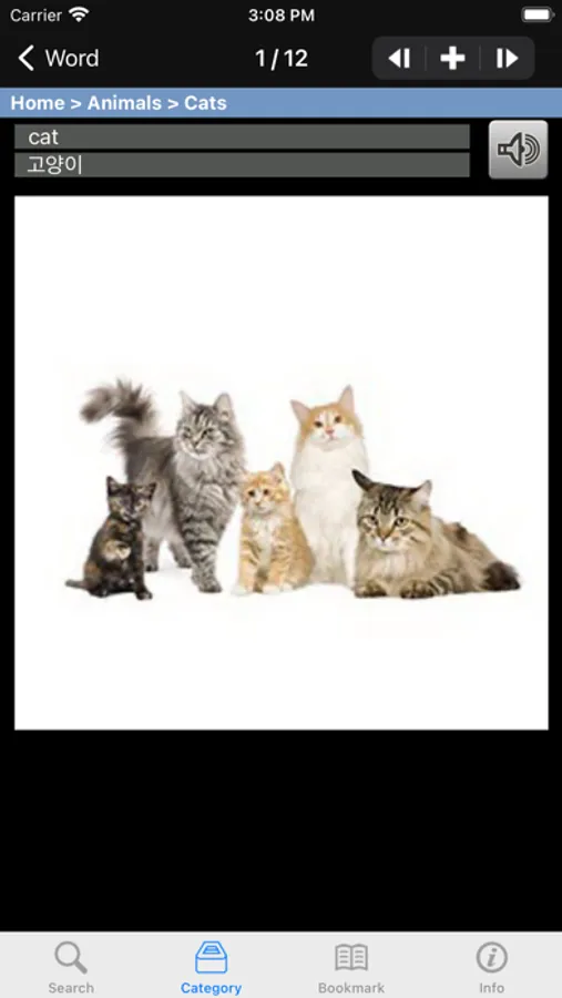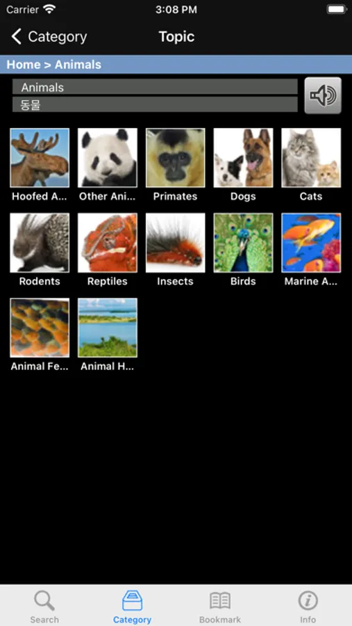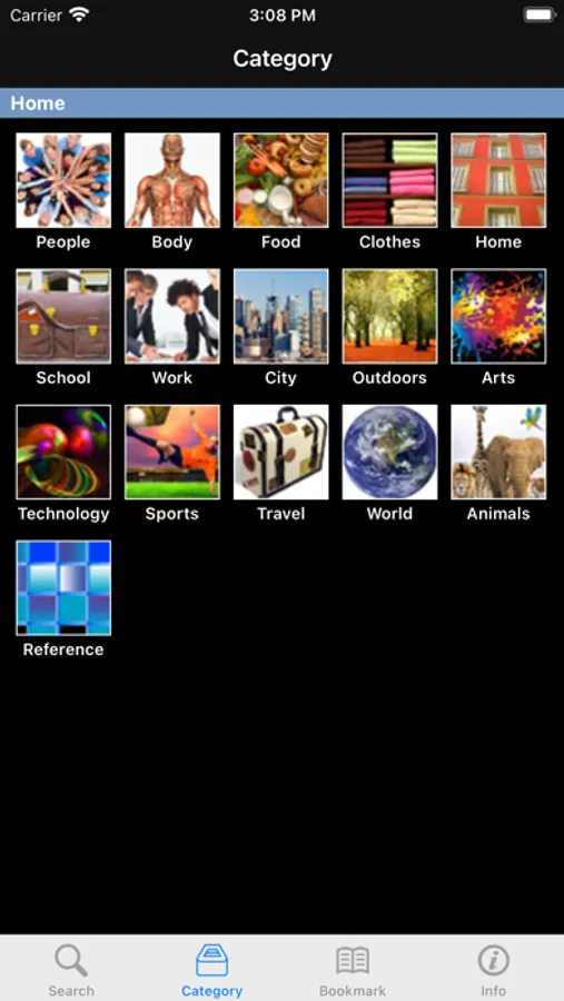 • 16 카테고리: 몸, 음식, 의류, 집, 학교, 일, 도시, 야외, 예술, 기술, 운동, 여행, 세계, 동물, 참고