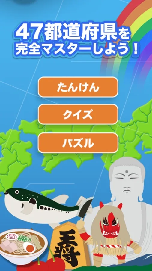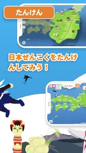 「日本地図マスター」は「たんけん」「パズル」「クイズ」3つのセクションをクリアすることで都道府県の位置や、名産、名所などを総合的に学ぶことができる社会科アプリです。