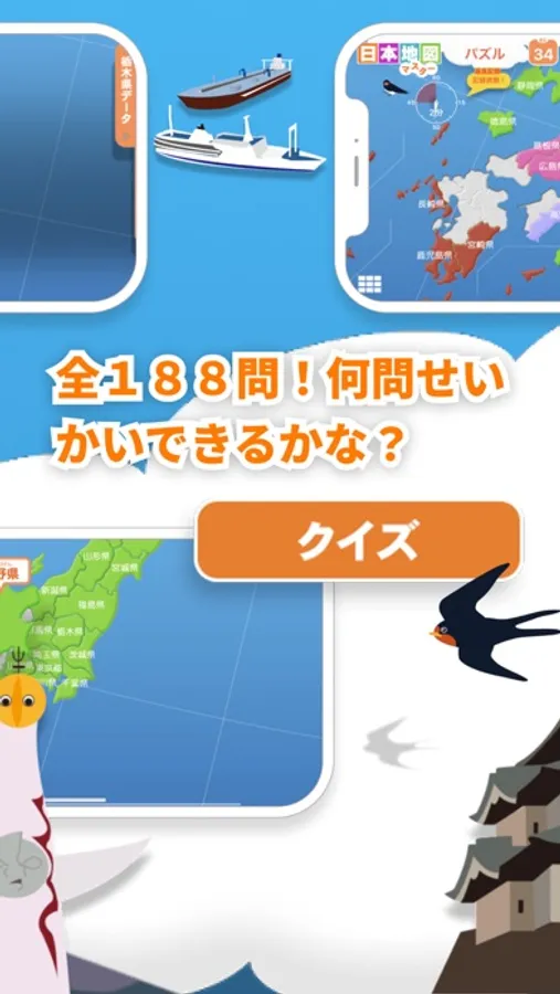 このアプリで遊んでいるうちに、都道府県の位置だけでなく、その県の特徴や特産品、名所旧跡などを楽しく覚えることができますので、いつの間にか日本地図に詳しくなります。