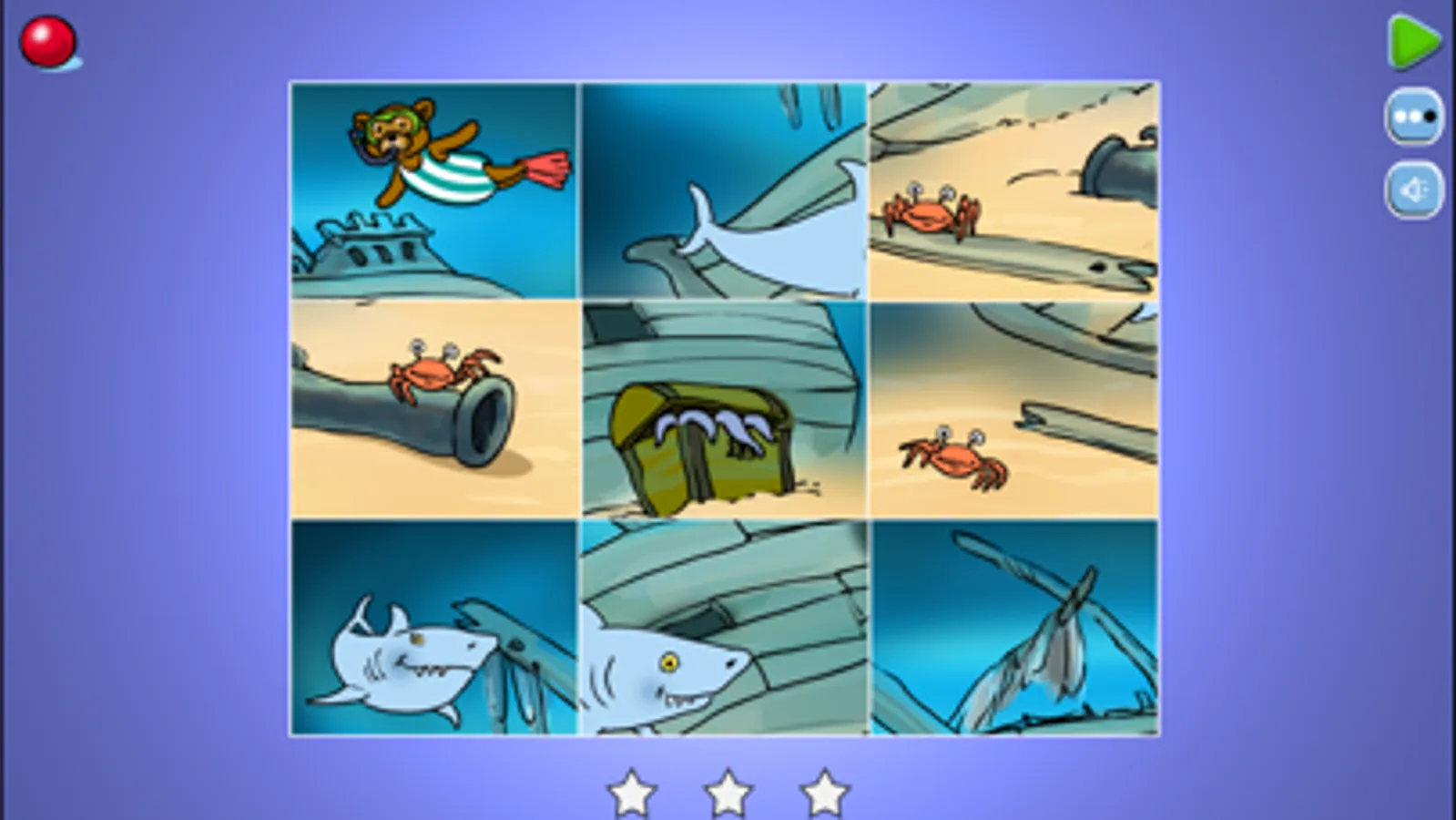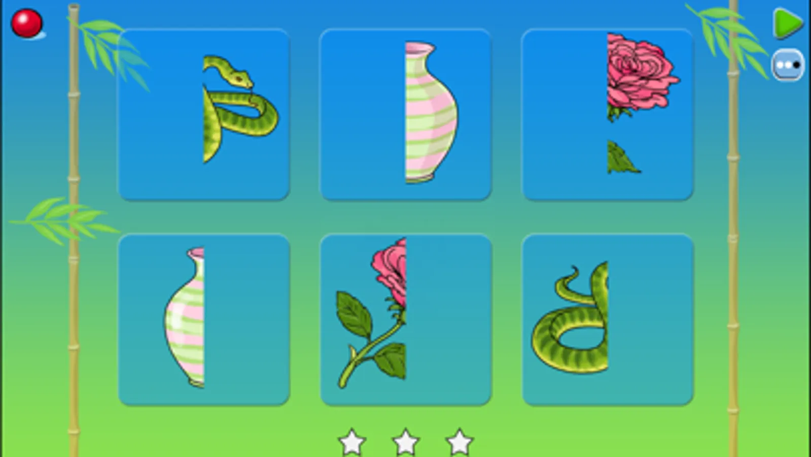 Pictures are divided into two halves. Drag one of the halves from the bottom row to the top. When the picture is complete the name of the object is spoken.