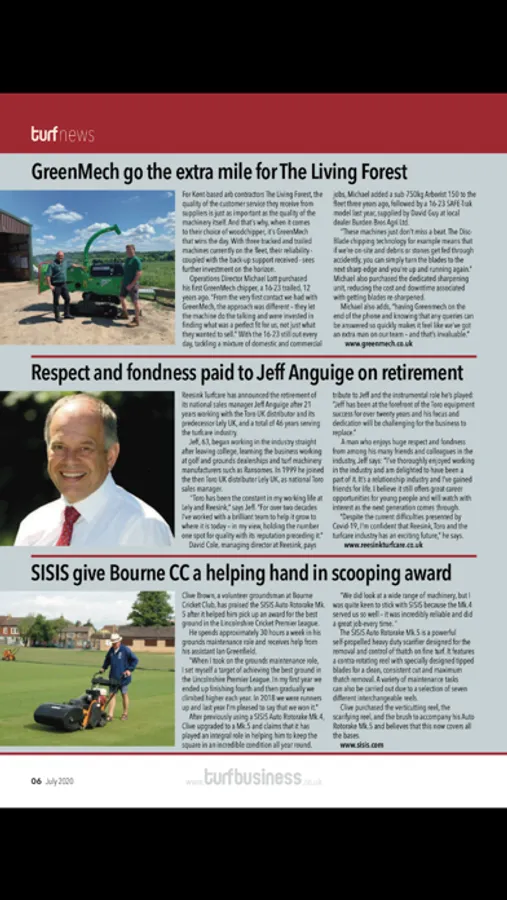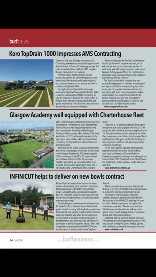 Turf Business is the monthly magazine for everyone whose business is turf - is available as a printed magazine, in digital format and now as an App on the Apple platforms, covering sports including golf, football, rugby, cricket, hockey, tennis, bowls and horse racing, as well as the leisure, amenity and local government sectors. Turf Business publishes a mixture of industry news and features in a concise and professional format aimed directly at turf care professionals to help bring a broader understanding of the problems facing and the solutions available the industry.