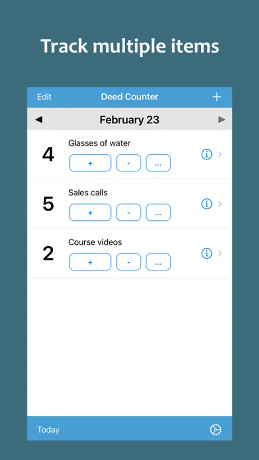 For instance, you can use the app to keep track of how many glasses of water you drink or how many books you read. Stop guessing and get the facts with Deed Counter.