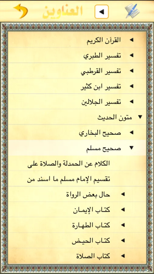 شاشة العناوين : الفصول والعناوين مقسّمة الى عناوين رئيسية وفرعية بطريقة منتظمة.