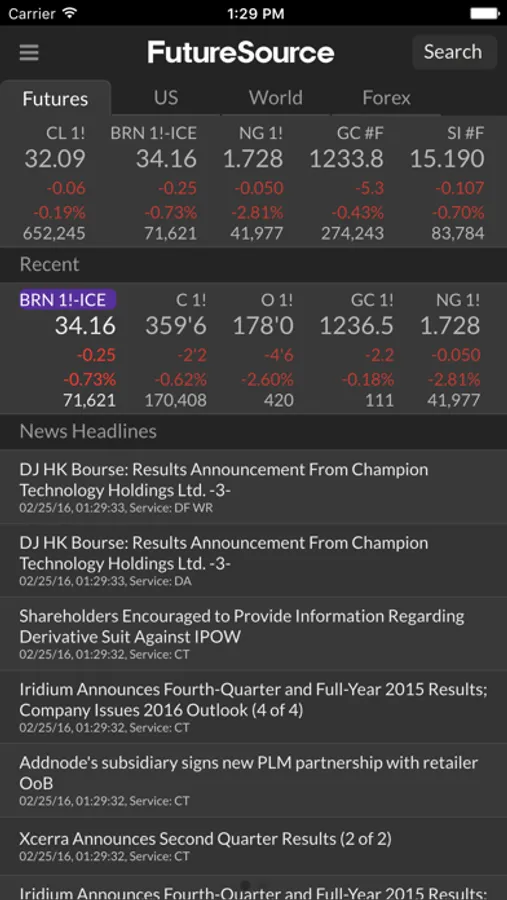 Watch List - access the core Watch List functionality you're used to from the FutureSource desktop, including your workspace watch lists. Changes made to Watch Lists will be saved to the FutureSource servers in real-time and will be accessible the next time you login to FutureSource on either your desktop or mobile device.