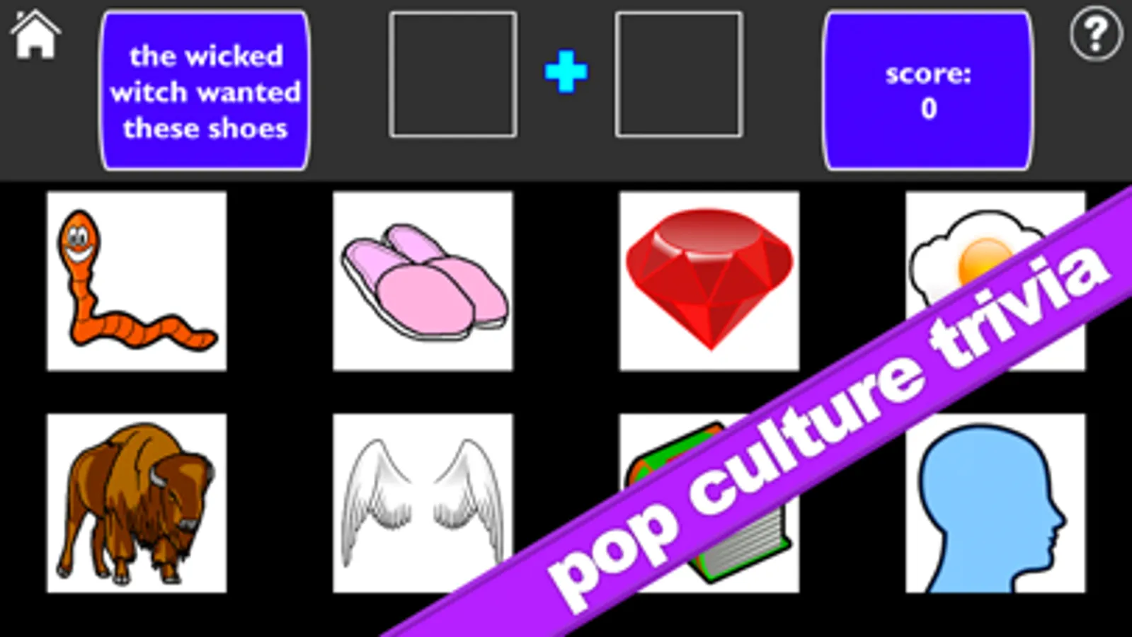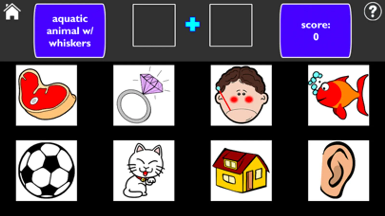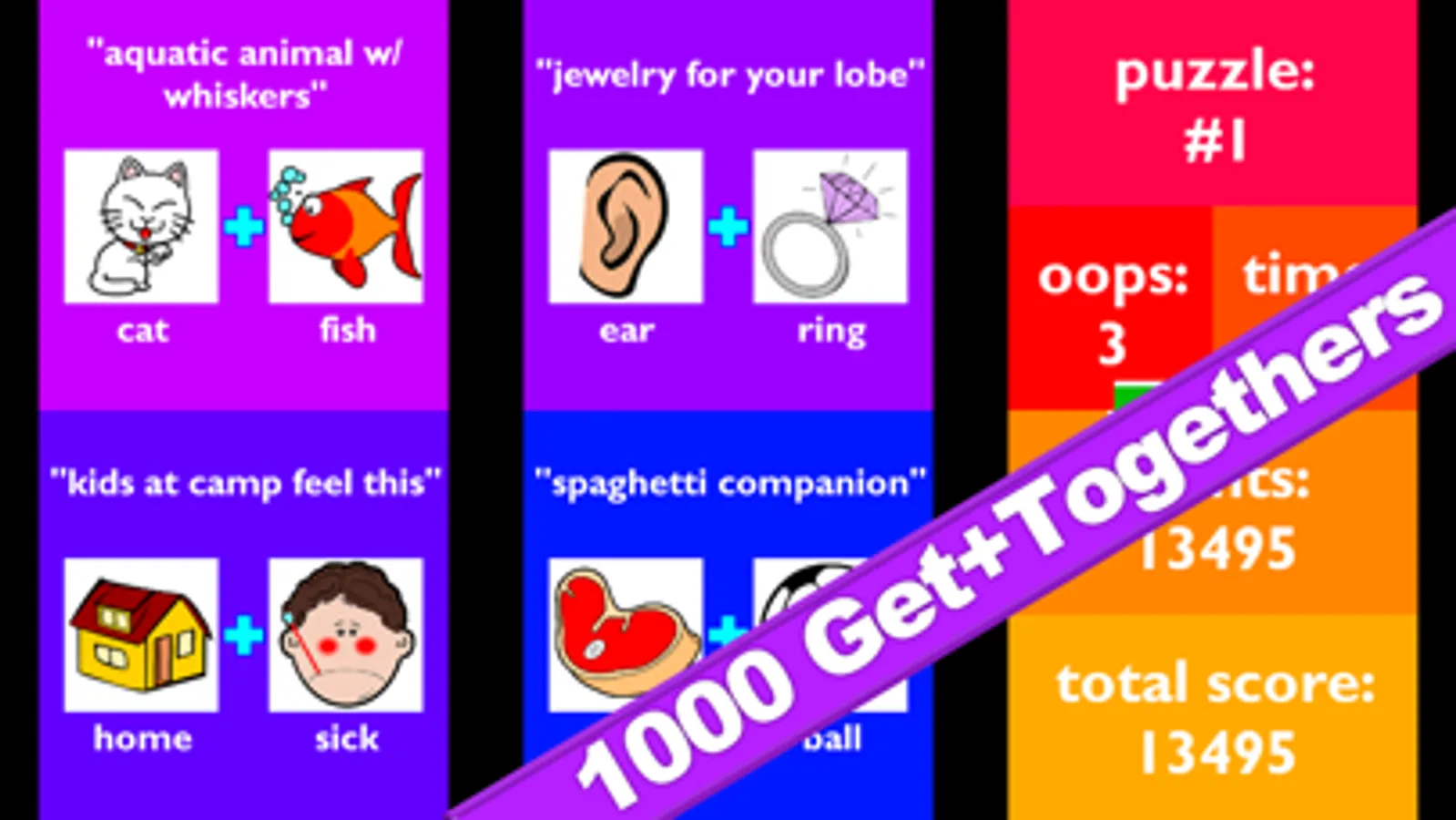 Get+Together requires no nasty typing or spelling. Just read a definition like "aquatic animal w/ whiskers." Then tap on 2 pictures to make a word or phrase that means the same thing -- like the pictures "cat" + "fish."