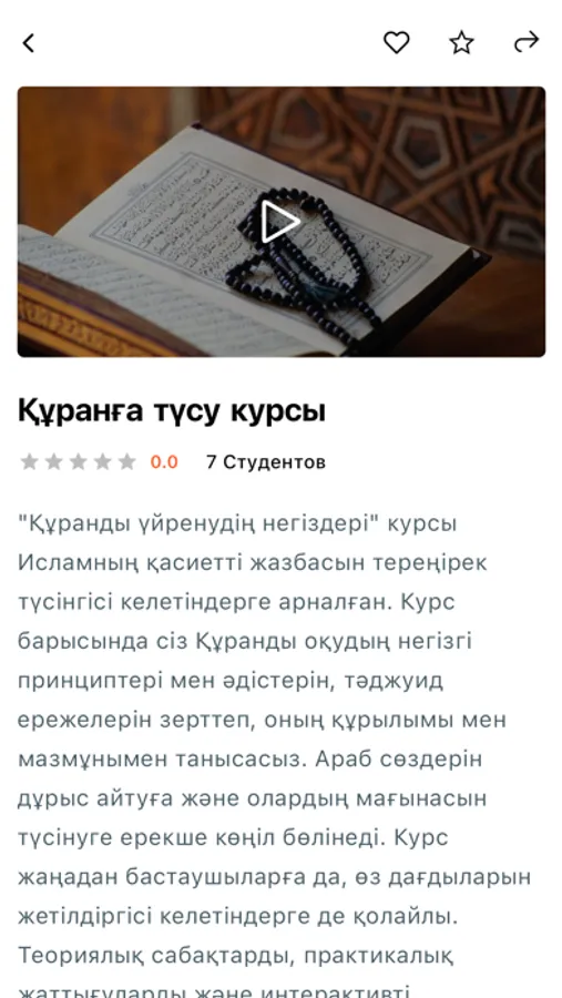 Эта мобильная платформа предназначена для обучения чтению Корана и усвоению правил таджуида. Пользователи могут учиться самостоятельно с помощью удобных видеоуроков. Пользователи могут закрепить свои знания, выполняя домашнее задание и тесты после видеоуроков. Это позволяет им систематически проверять и дополнять свои знания.