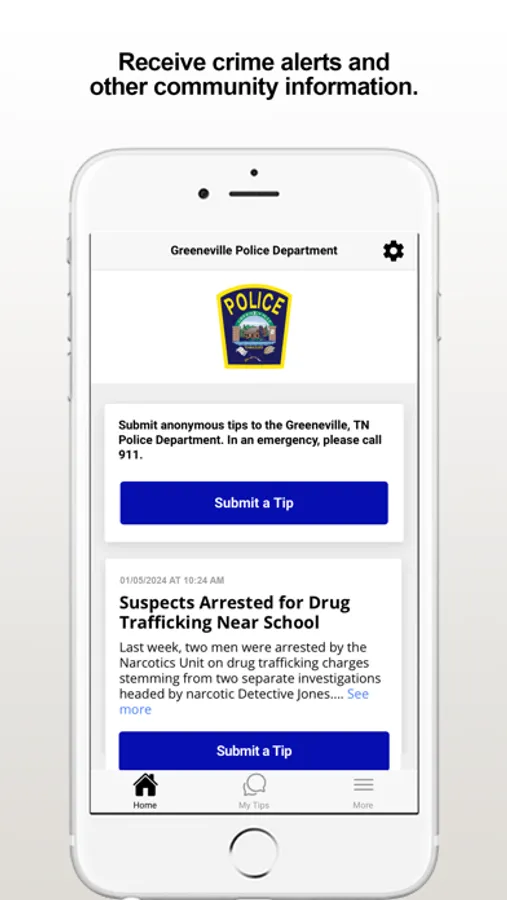 The Greeneville PD app provides citizens the ability to submit anonymous tips to the Greeneville, TN Police Department. The app also displays agency crime alerts and other organization web and social media content.