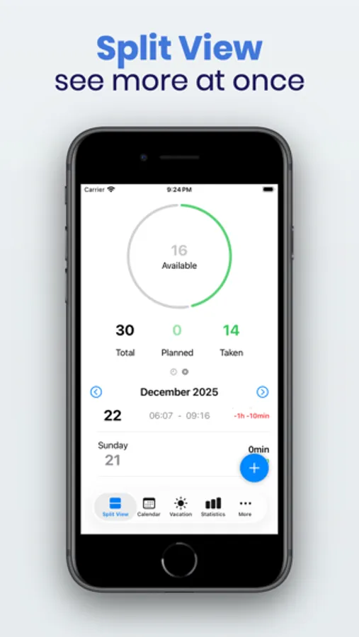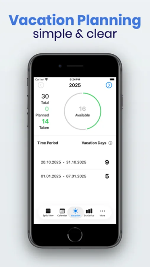 - Built-in vacation management (available, planned, taken days)
