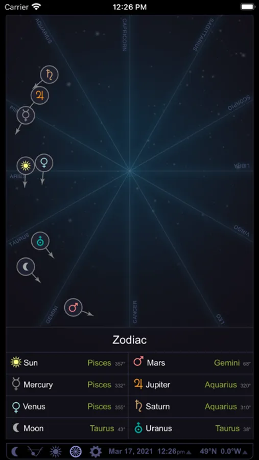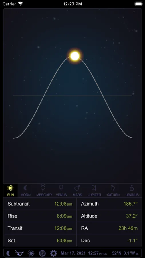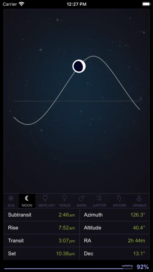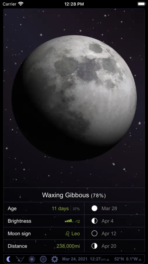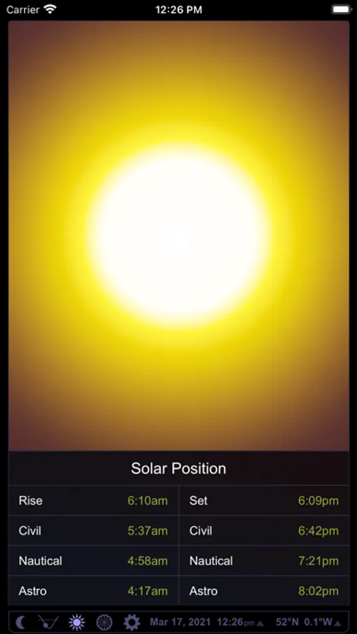 Now you can have accurate, attractive Moon and Sun details at your fingertips. View a beautiful real-time image of the current Moon phase, complete with technical data. Quickly see if the Moon is above the horizon and find Moon rise and set times and precise Moon position in the sky by looking at the Lunar Position screen. If you also want to know Sun rise and set times, look at the Solar Position screen.