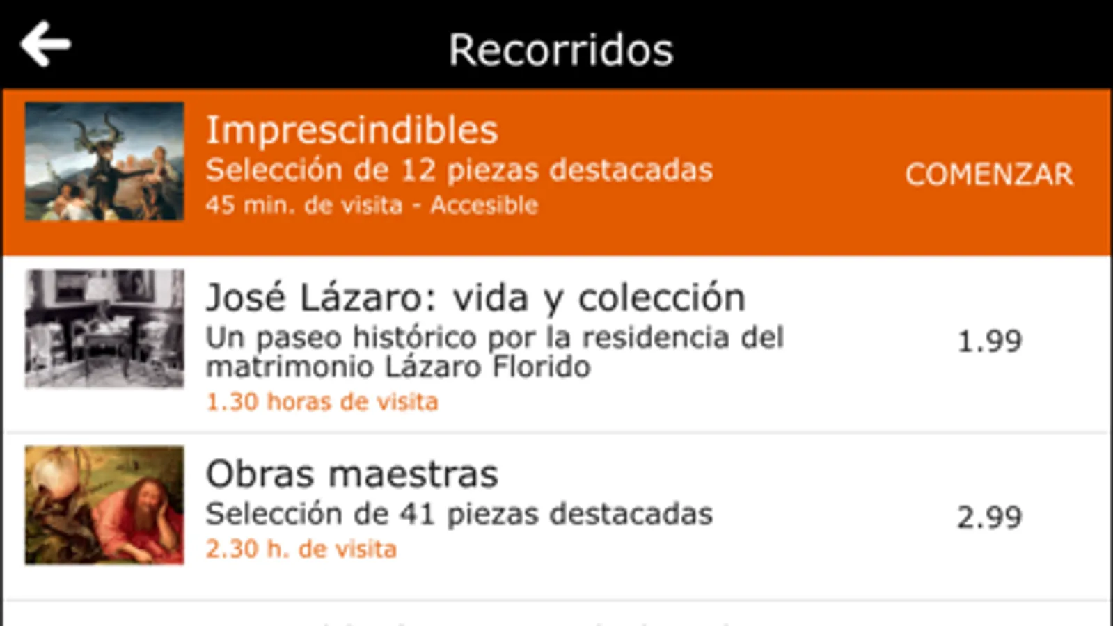 La guía está diseñada para que la disfrutes dentro del museo, aunque podrás utilizarla desde cualquier lugar. La app preselecciona el contenido siguiente para facilitarte la navegación. Al pulsar el botón situado en la esquina superior izquierda de la pantalla, podrás acceder a un menú con opciones adicionales.