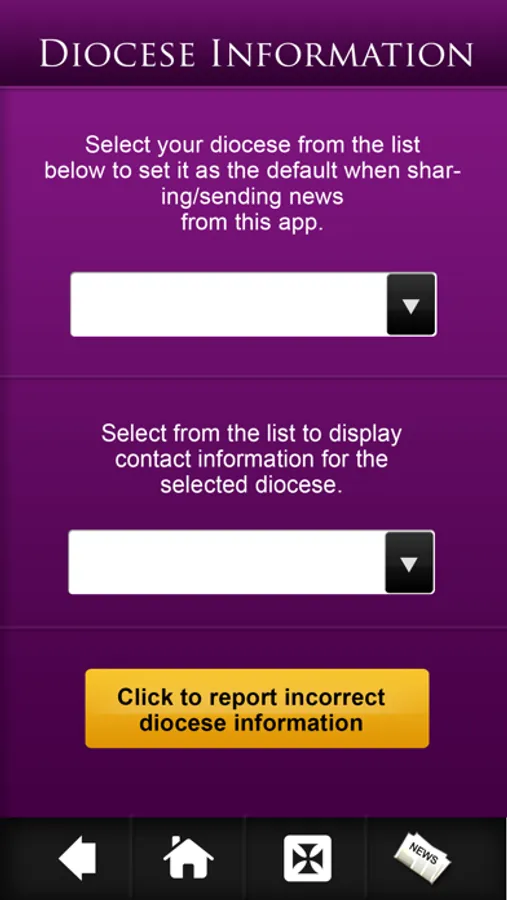 ~~>Enables users to easily contract Bishop/Diocese or share news stories with the same, directly via the app.