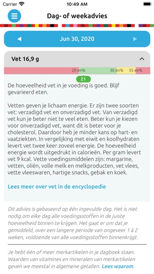 Op het etiket staat hoeveel energie, vet, verzadigd vet, eiwit, koolhydraten zout en soms ook vezels er in het product zit. In Mijn Eetmeter krijg je voor deze voedingsstoffen direct een advies op maat. Maar je kunt in Mijn Eetmeter ook letten op vitamines en mineralen.