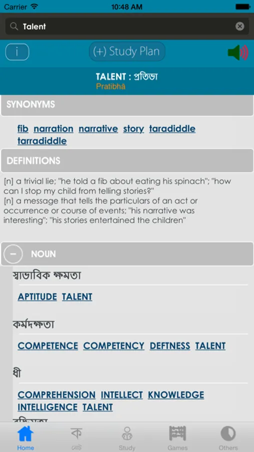 This is not only a dictionary but also a learning tool. MCQ (Multiple Choice Question) option available. There is auto suggestion so you need not type full words. You can add words to study plan.